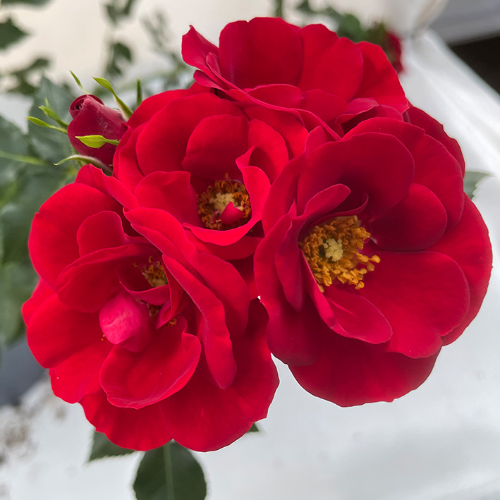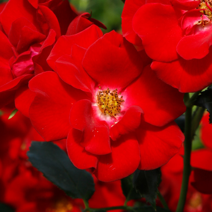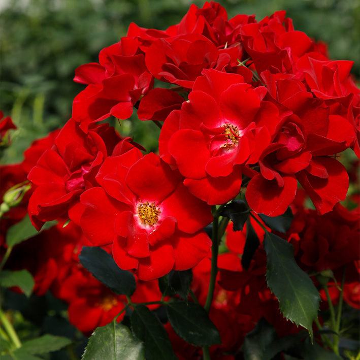 Blomst: Mørkerøde åbne blomstser med synlige støvdragere. Overvældende blomstring.
