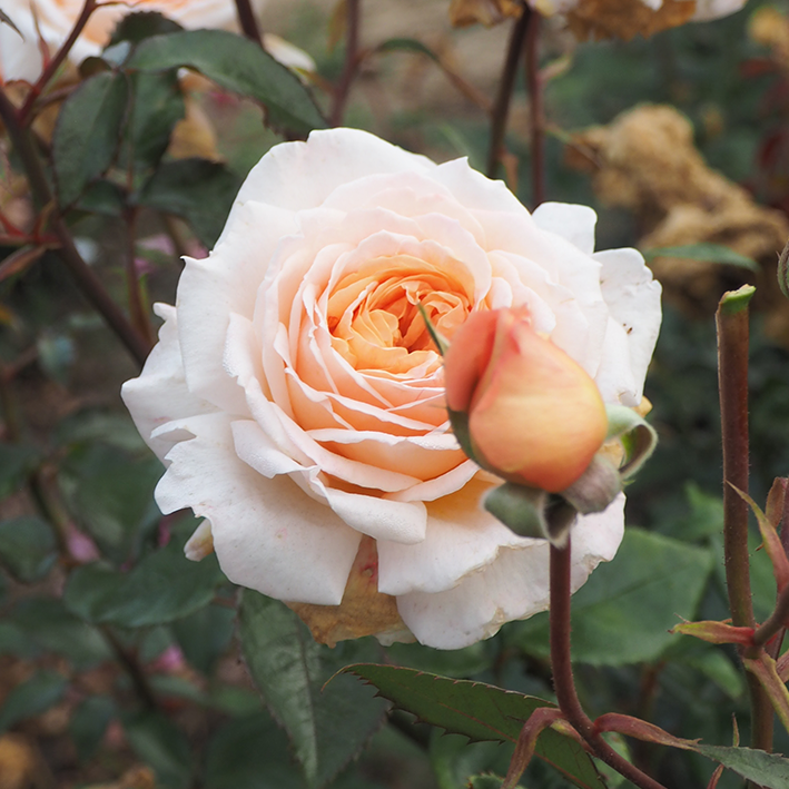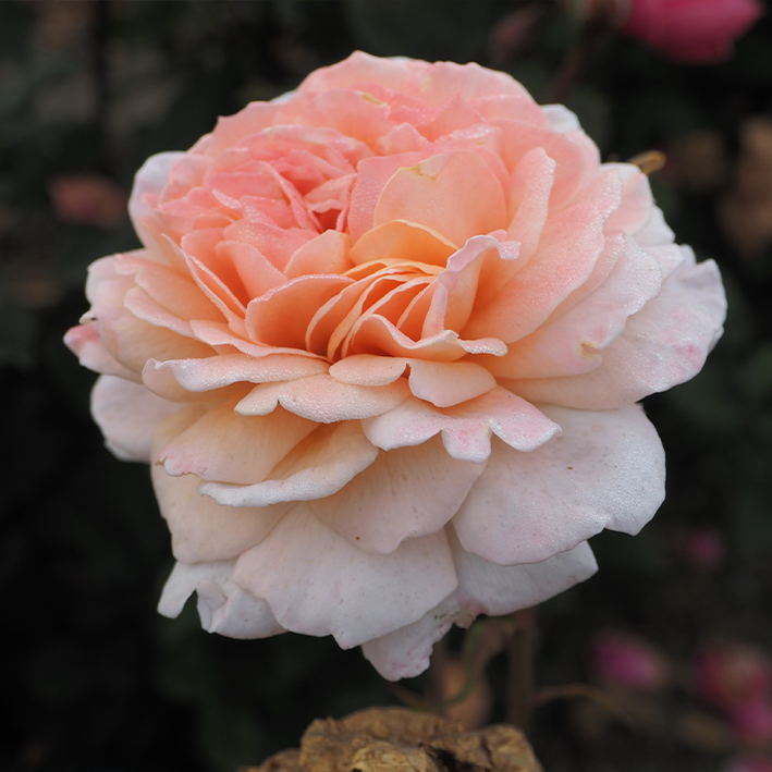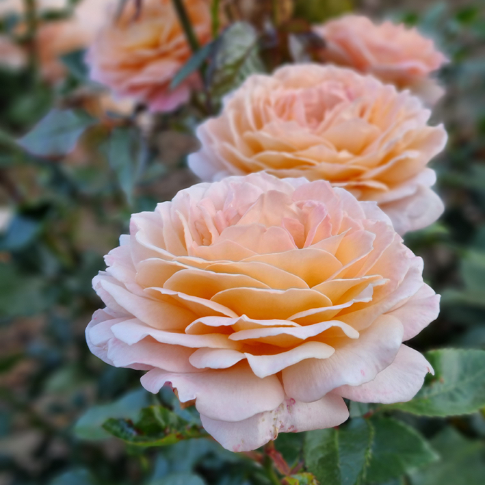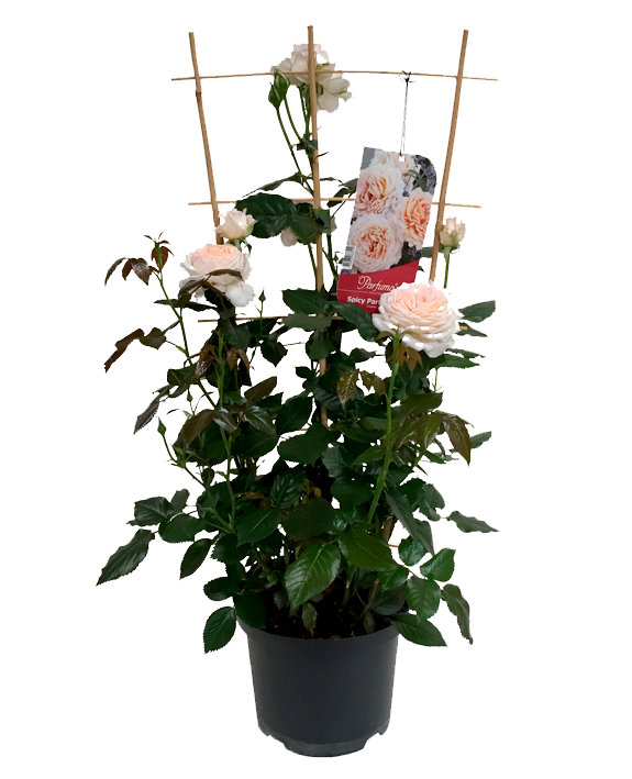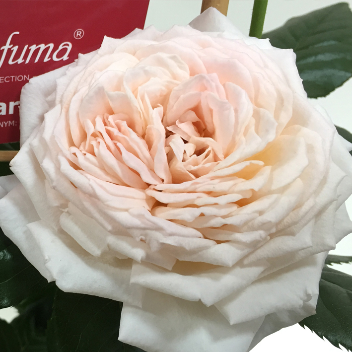 Blomst: Store smukke, tætfyldte, lyst abrikosfarvede blomster med rosa midte og stærk duft af fersken med strejf af pære, magnolie og roser.