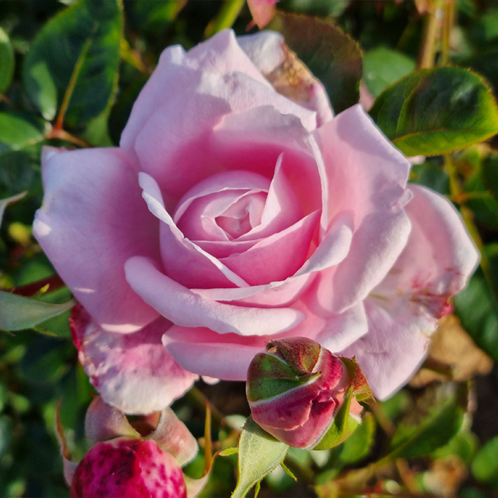 Blomst: Store, fyldte, lyserøde blomster med kraftig duft.